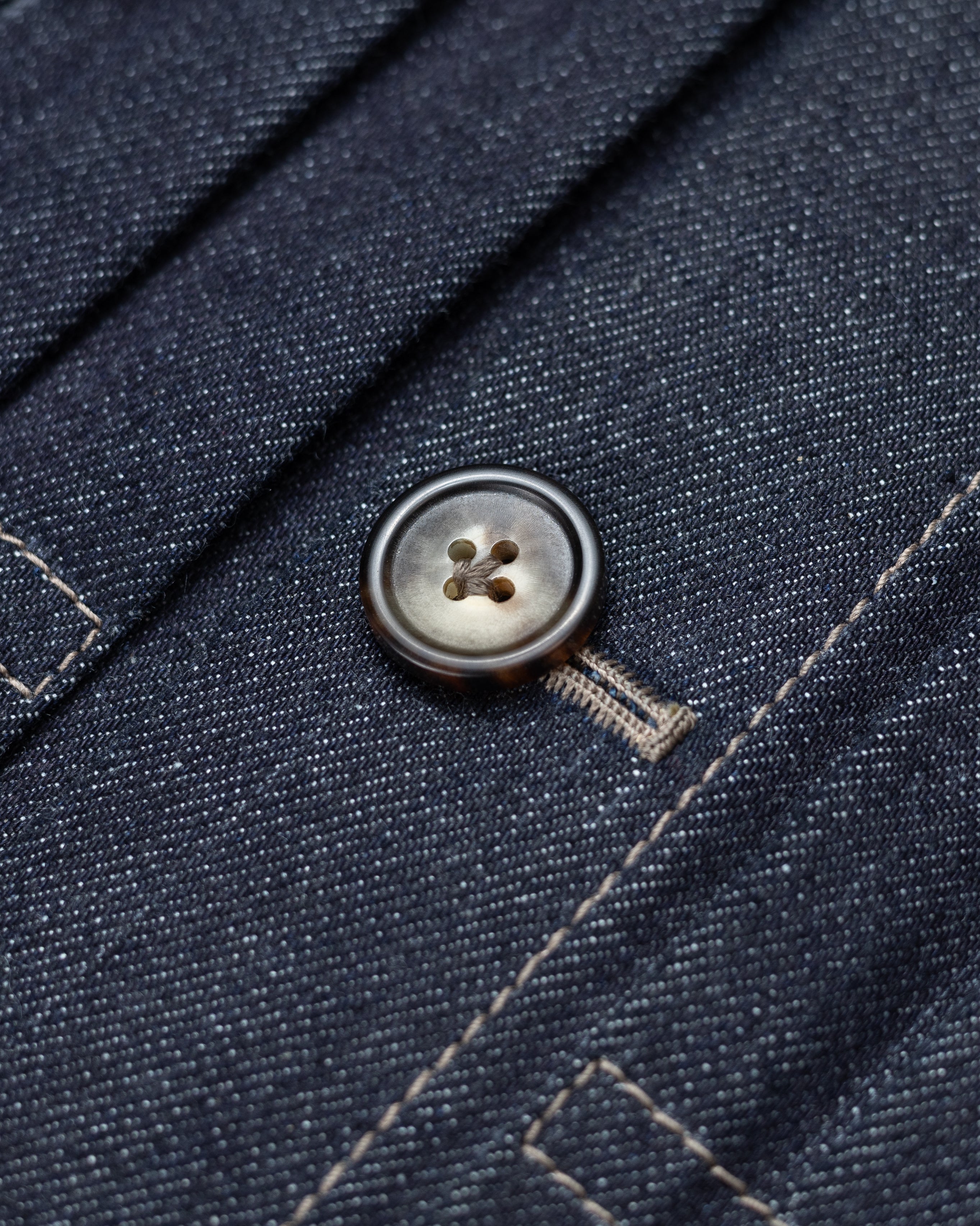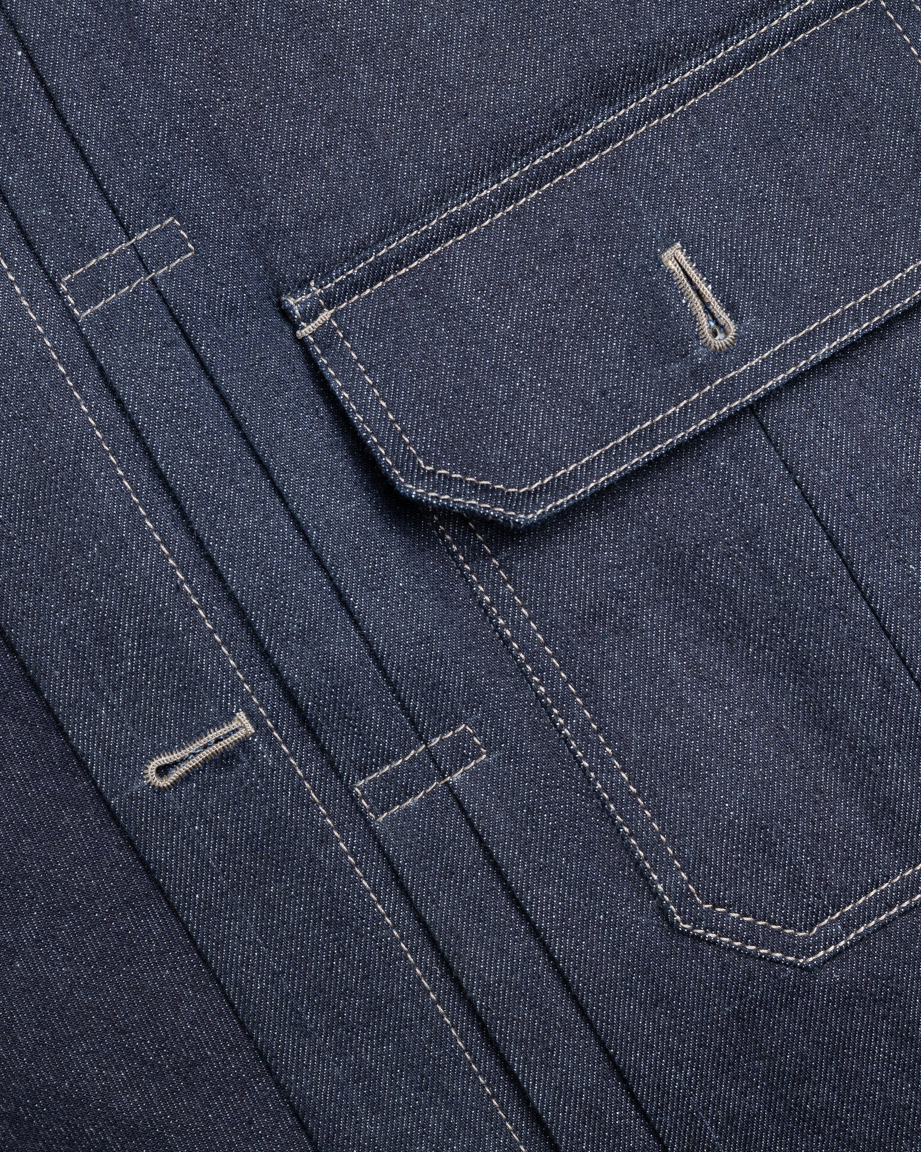 Chacune de nos vestes en denim intègre onze boutonnières ainsi que quatorze brides entièrement façonnées à la main. Ce geste minutieux, confère à chaque pièce une caractère unique, perceptible aussi bien au regard qu’au toucher.